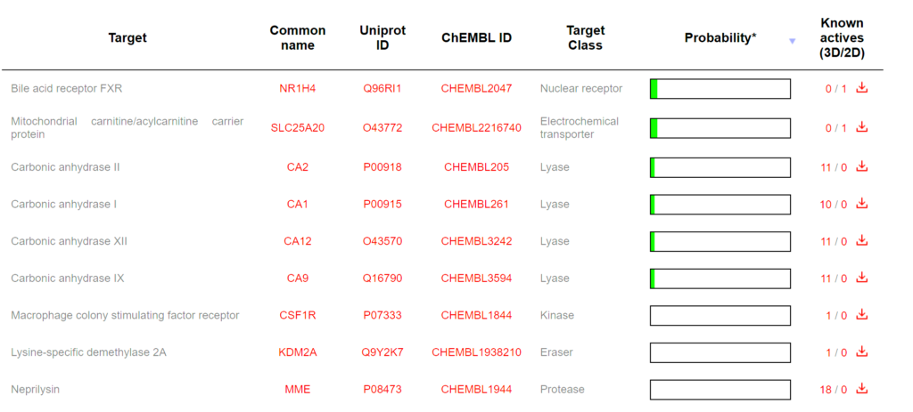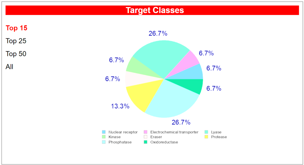 Computational target prediction analysis reveals that Acetyl L-Carnitine interacts with multiple protein classes within the body, reflecting its diverse biological activities and mechanisms of action. The predicted target distribution identifies nine primary protein targets spanning eight distinct enzymatic and receptor classes. The most prominently predicted binding targets are the Nuclear receptor (bile acid receptor FXR) and Lysase enzymes (carbonic anhydrases I, II, IX, and XII), each representing approximately 26.7 percent of the predicted interactions. These predictions are supported by established biochemical evidence that ALCAR influences nuclear receptor signaling pathways and carbonic anhydrase activity, which are critical for cellular pH regulation and metabolic processes. Additional predicted targets include the Mitochondrial carnitine/acylcarnitine carrier protein (SLC25A20), classified as an Electrochemical transporter, which aligns with ALCAR’s known physiological role in fatty acid transport across the mitochondrial membrane.