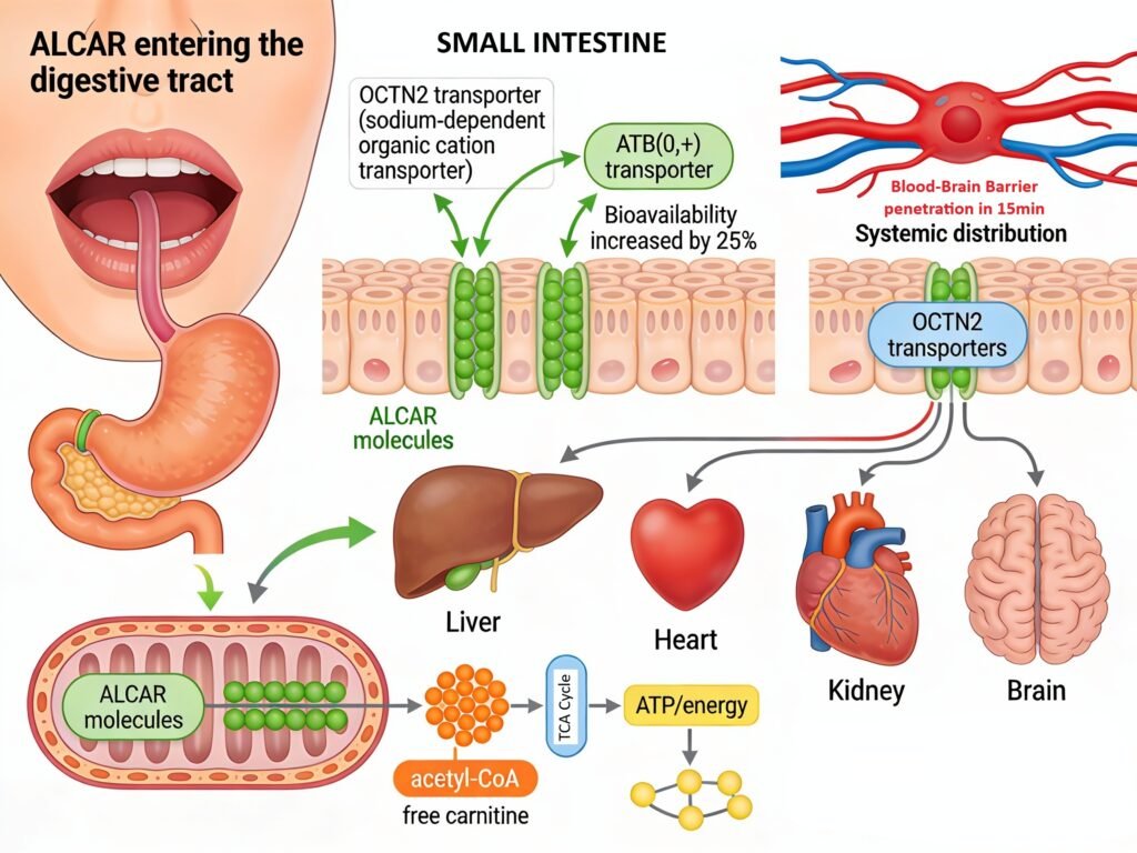 Once absorbed, ALCAR is rapidly distributed to multiple tissues including the liver, heart, kidney, and brain, crossing the blood-brain barrier within 15 seconds of systemic circulation through the OCTN2 transporter via a sodium-dependent active transport mechanism. In the brain and peripheral tissues, ALCAR enters mitochondria where it undergoes rapid metabolic conversion to free carnitine and acetyl-CoA, compounds essential for cellular energy production and neurotransmitter synthesis. The acetyl-CoA moiety enters the tricarboxylic acid (TCA) cycle for oxidative energy production, while the free carnitine remains available for facilitating long-chain fatty acid transport across the mitochondrial membrane. This metabolic architecture explains why ALCAR supplementation is particularly effective at improving mitochondrial function and energy production in tissues with high metabolic demands, such as the brain and skeletal muscle.