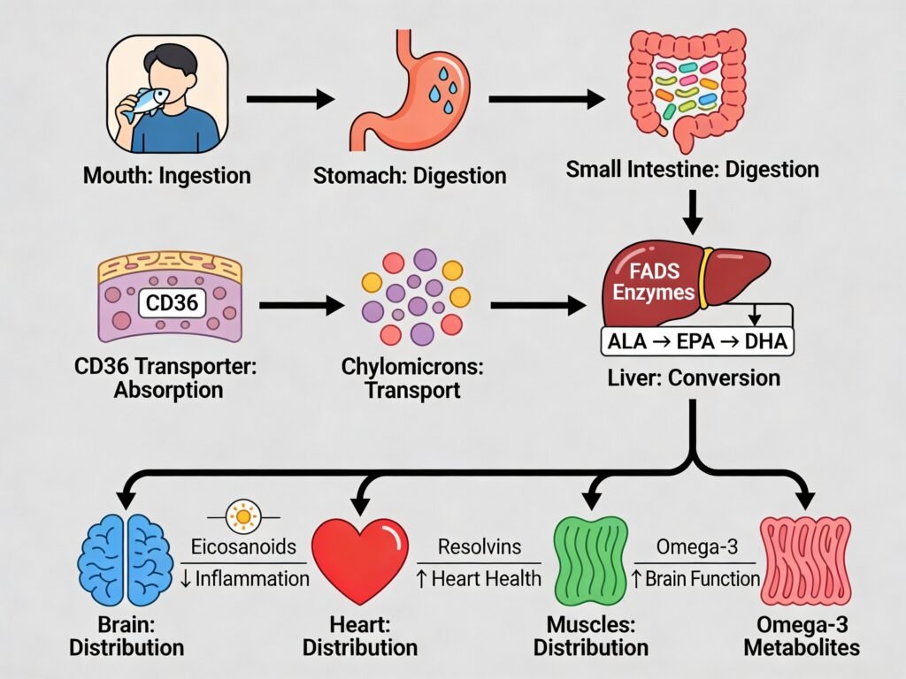 After absorption in the small intestine, omega-3 fatty acids are packaged into chylomicrons and transported through the lymphatic system into the bloodstream. From there, they travel to the liver and other tissues where they are incorporated into cell membranes, incorporated into signaling molecules like eicosanoids, and used for energy production. The efficiency of this entire process depends on your individual genetic makeup, digestive capacity, liver function, and overall nutrient status. Understanding these factors helps explain why some people experience more pronounced benefits from omega-3 supplementation than others