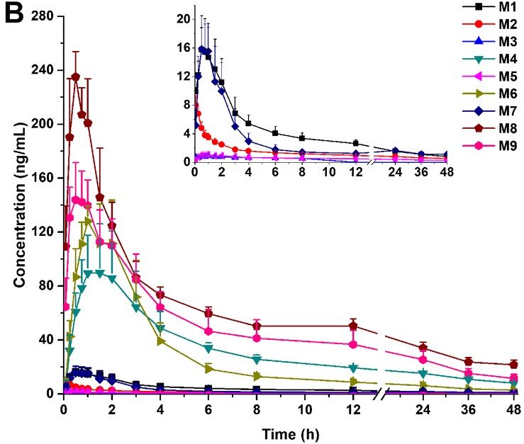 The second figure shows that M1 through M9 become prominent after administration, with several metabolites reaching much higher concentrations than berberine itself. This indicates that berberine’s in vivo behavior is driven by extensive metabolism, and that its biological activity should be understood as the combined effect of the parent compound and its circulating metabolites.