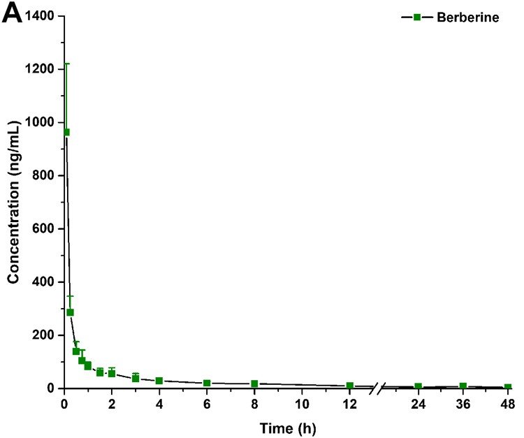 The two figures (from Feng et al., 2021) show a clear pharmacokinetic pattern for berberine in rats, with the parent compound rising rapidly after dosing and then declining steeply over time. This profile is consistent with low oral exposure and fast clearance, which helps explain why berberine concentrations in blood remain relatively limited compared with its downstream metabolites.