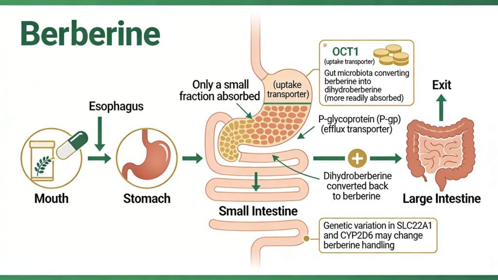 The main transporter linked to uptake is OCT1, encoded by SLC22A1, while P-glycoprotein (P-gp) can limit uptake by pumping berberine back into the intestinal lumen. After passing through the small intestine, some berberine is metabolized by gut microbes into dihydroberberine, which is absorbed more easily and then converted back to berberine inside intestinal tissue. Genetic variation can change this process too, especially in SLC22A1 and CYP2D6, and one human study found that CYP2D6 differences affected berberine metabolism, with stronger effects seen in females, while OCT1 variation did not always produce the same effect across studies.