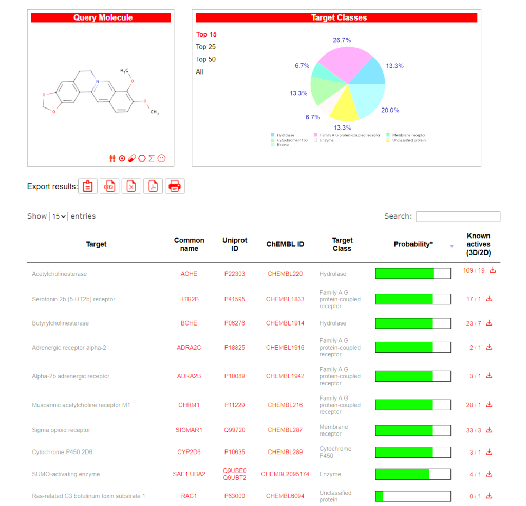 Berberine’s predicted targets point to several key biological systems, which helps explain why it is studied as a multi-pathway botanical compound rather than a single-purpose ingredient. The main targets in this analysis include acetylcholinesterase and butyrylcholinesterase, which break down acetylcholine and affect nerve signaling, along with the serotonin 5-HT2B receptor, alpha-2 adrenergic receptors, and the muscarinic acetylcholine receptor M1, all of which are involved in brain, cardiovascular, and autonomic signaling.