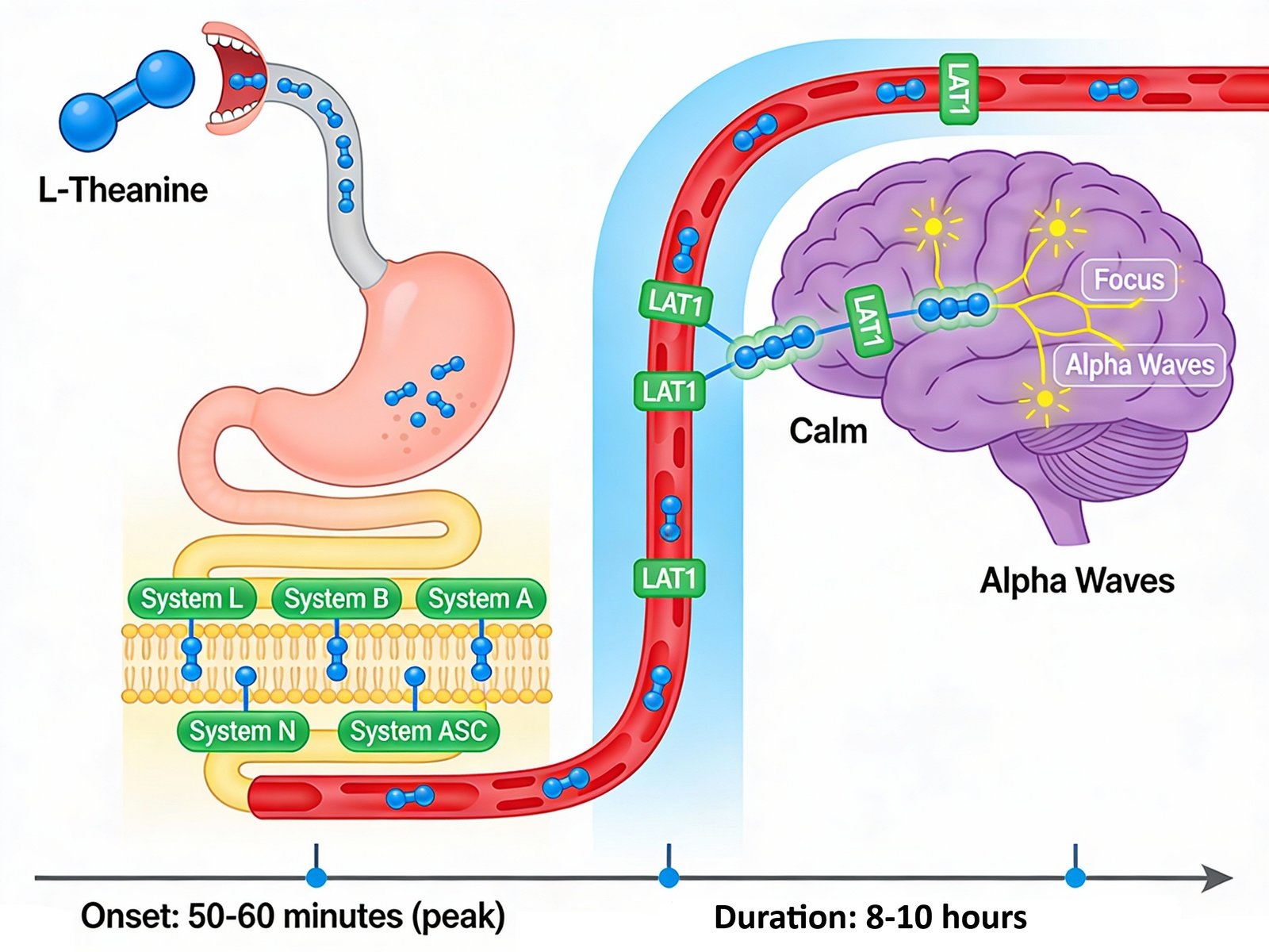 L-Theanine’s journey through the digestive system begins in the mouth, where it remains largely unchanged as saliva contains minimal enzymes capable of degrading amino acids. Upon swallowing, L-Theanine travels through the esophagus and enters the stomach, where acidic conditions and proteolytic enzymes do not significantly metabolize it due to its unique molecular structure and protective peptide bonds. The compound then proceeds to the small intestine, the primary site of L-Theanine absorption, where it encounters specialized amino acid transporters embedded in intestinal epithelial cells. These transporters, particularly System L (LAT1 and LAT2), System B (ATB0+), System A (SNAT2), System ASC (ASCT2), and System N (SN1 and SN2), recognize L-Theanine’s structure and actively transport it across the intestinal barrier into the bloodstream. Peak plasma concentrations are reached 50 to 60 minutes after oral ingestion, with a plasma half-life of 54 to 78 minutes, allowing rapid distribution to the brain and peripheral tissues. L-Theanine that is not absorbed in the small intestine continues to the colon, where minimal fermentation occurs due to its resistance to bacterial degradation, with most unabsorbed L-Theanine excreted in feces.