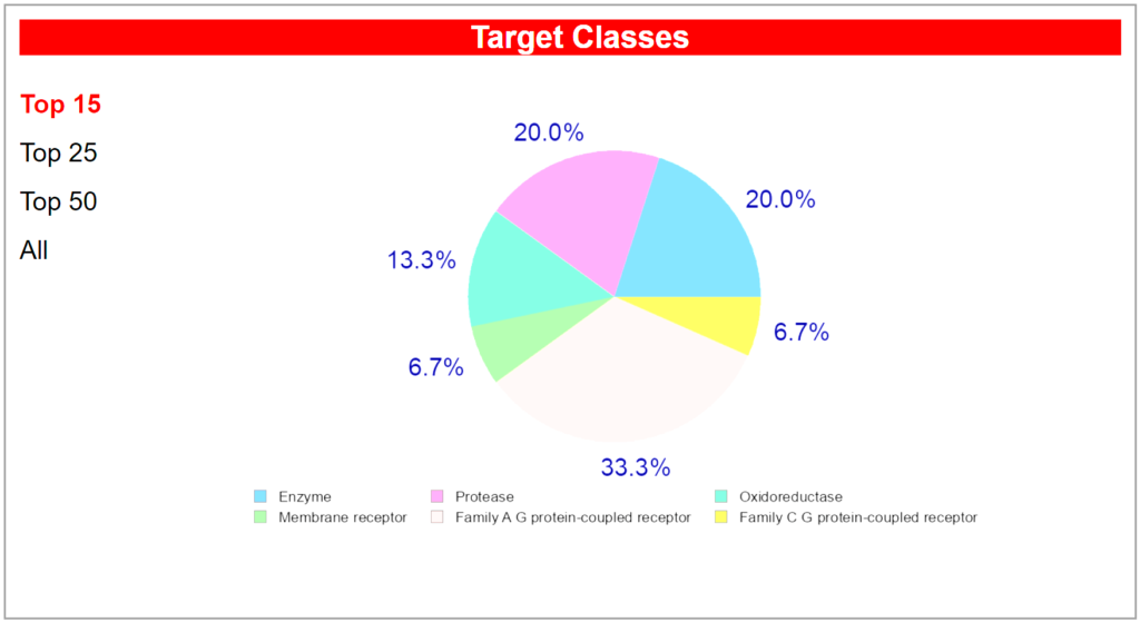 Computational drug discovery analysis has identified multiple molecular targets through which L-Theanine exerts its pharmacological effects on the central nervous system. The predicted target distribution reveals that L-Theanine interacts with diverse protein classes, including enzymes (20.0%), proteases (20.0%), oxidoreductases (13.3%), membrane receptors (6.7%), and G-protein coupled receptors (26.7% combined across Family A and Family C subtypes). Among the most prominent predicted targets are nitric-oxide synthase (NOS1), kynurenine 3-monooxygenase (KMO), dipeptidyl peptidase IV (DPP4), and various serotonin receptor subtypes (5-HT1A, 5-HT2A, 5-HT2C, and 5-HT7). This multi-target pharmacology distinguishes L-Theanine from single-mechanism pharmaceuticals and explains its broad spectrum of neurological and psychological benefits.